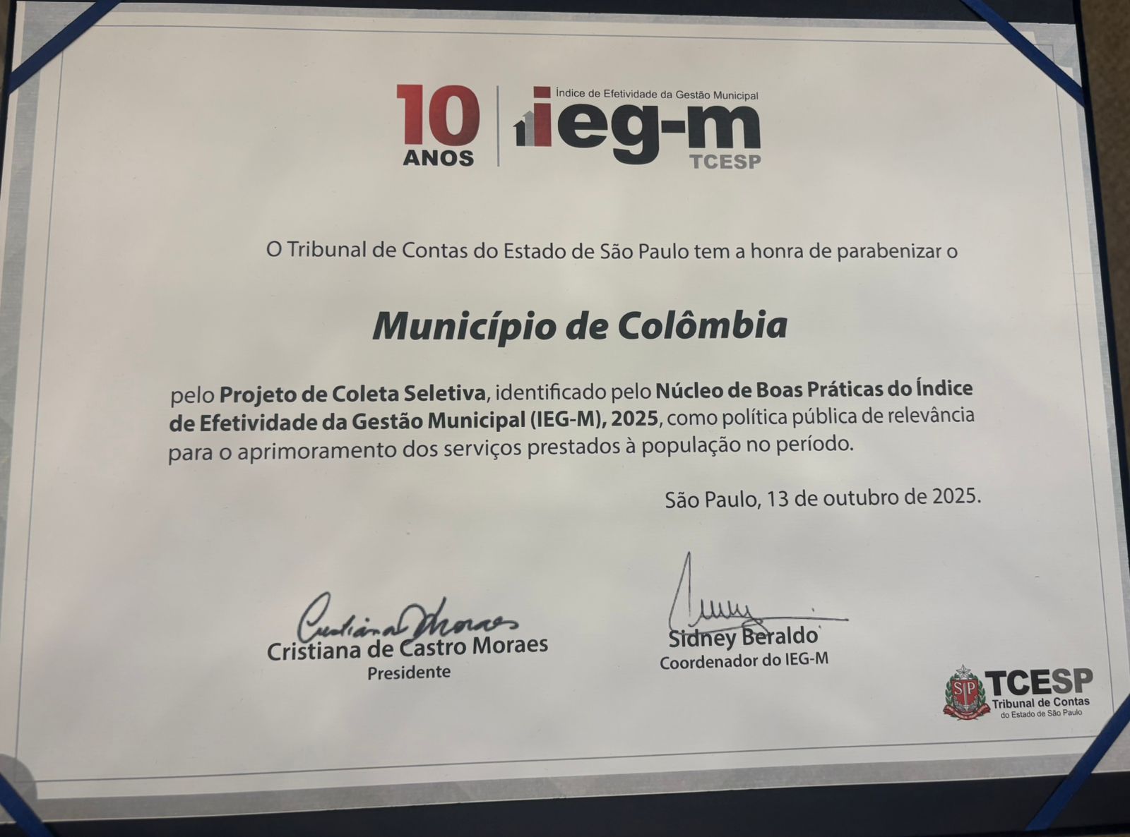 Com o reconhecimento do Tribunal de Contas do Estado de São Paulo, o Projeto de Coleta Seletiva de Colômbia passa a integrar oficialmente o Núcleo de Boas Práticas do IEG-M 2025, sendo referência em sustentabilidade e gestão pública eficiente. O resultado reforça a transparência e a efetividade da administração municipal, além de demonstrar que o investimento em políticas de longo prazo traz retorno ambiental, social e econômico.