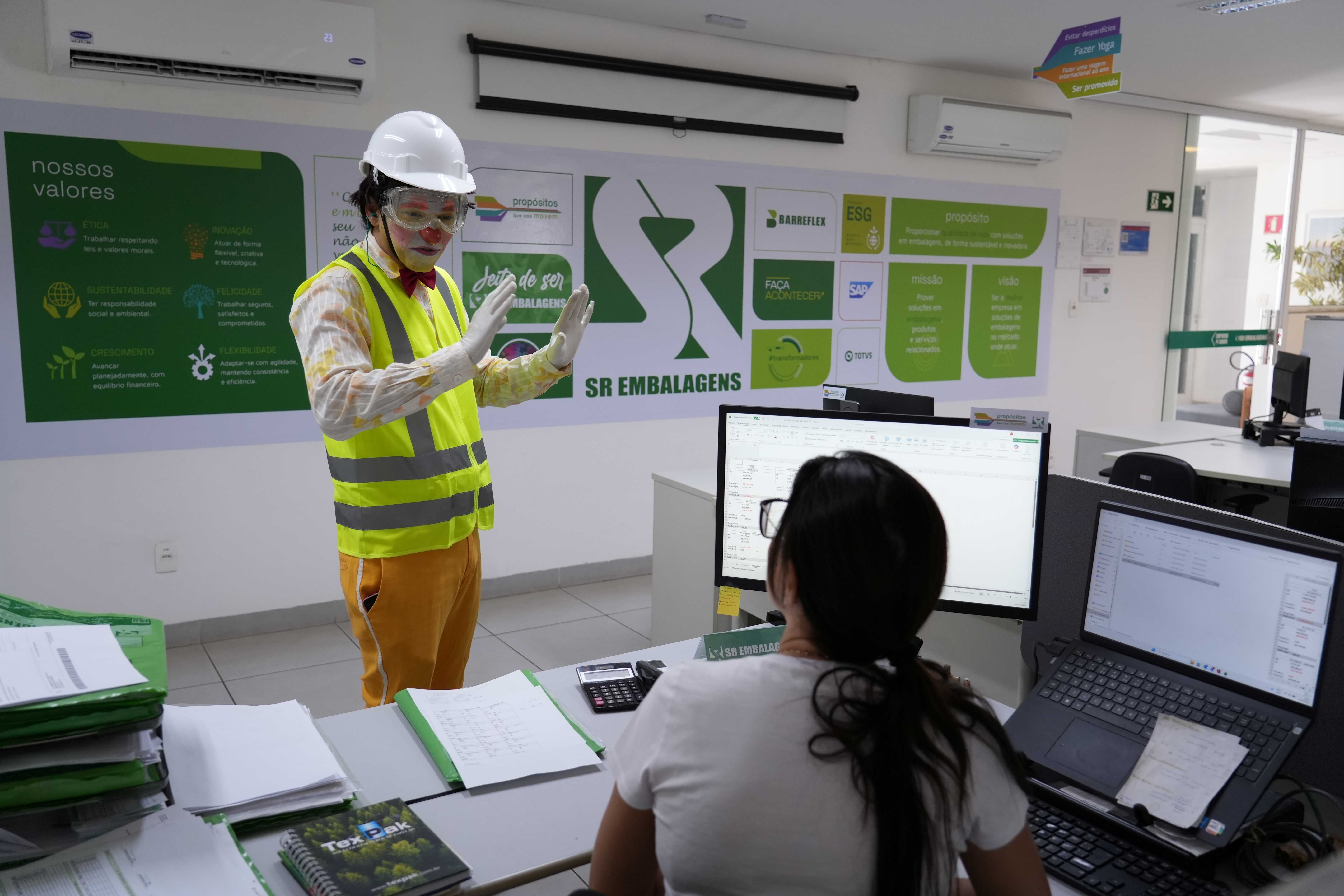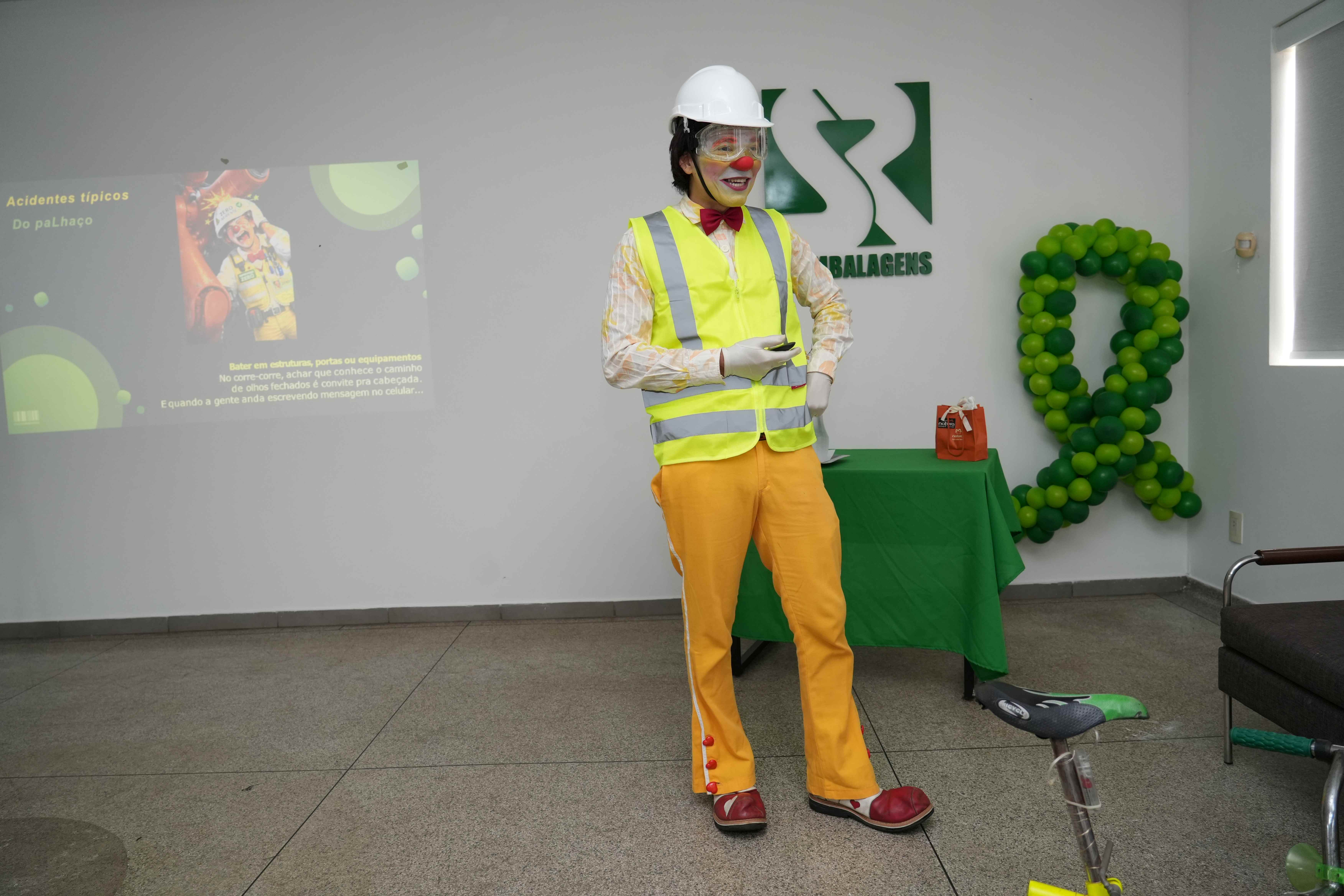 Mais do que uma palestra tradicional, a ação foi pensada para romper com o formato convencional, muitas vezes visto como cansativo, repetitivo e pouco envolvente. Na SR Embalagens, o diferencial esteve justamente na forma de comunicar: pela manhã, o palestrante Vagner Cotrim, caracterizado como palhaço e interpretando o personagem “Supervisor Zero Acidente”, percorreu os setores da empresa convidando os colaboradores para o encontro da tarde, criando proximidade, curiosidade e conexão com o tema antes mesmo do início oficial da atividade.